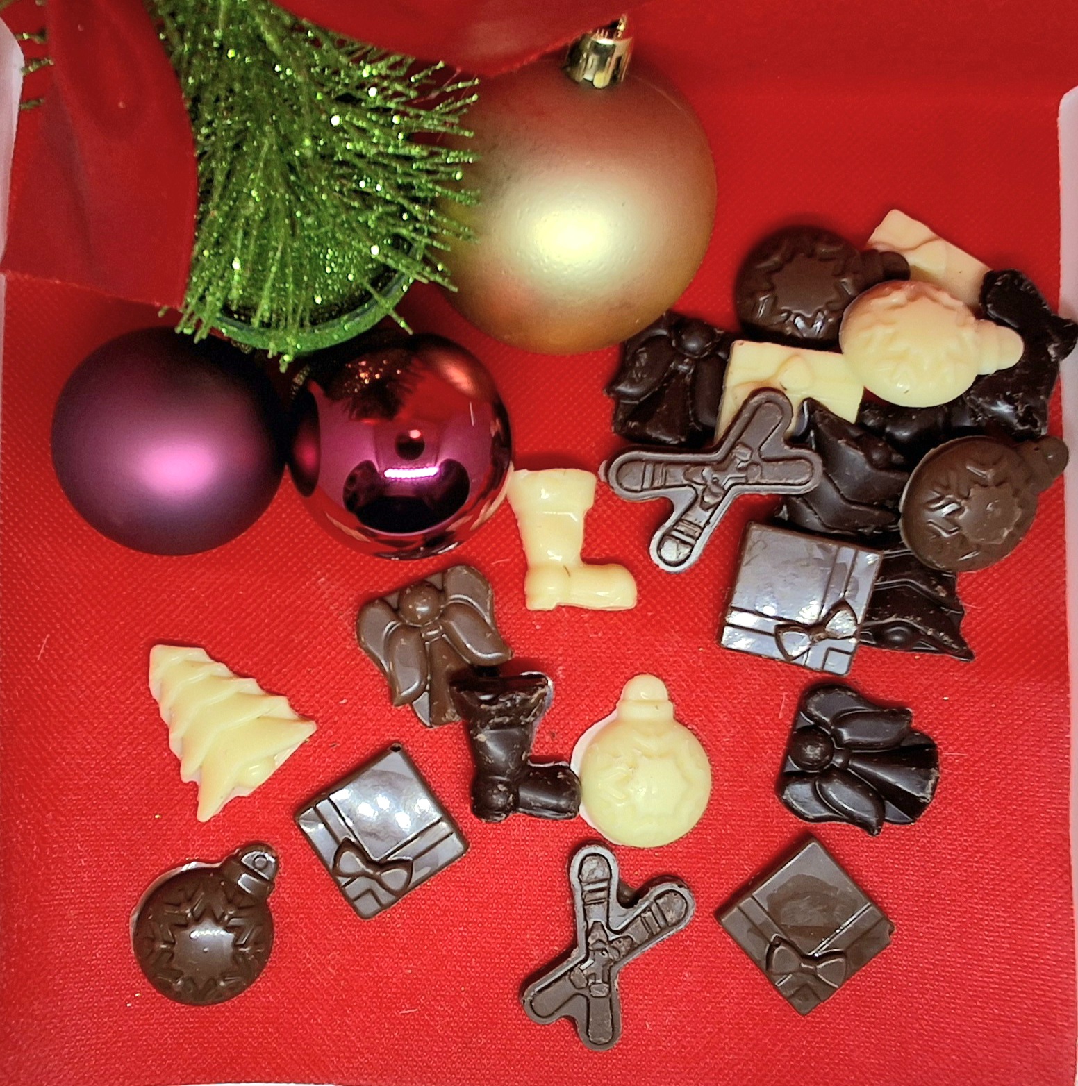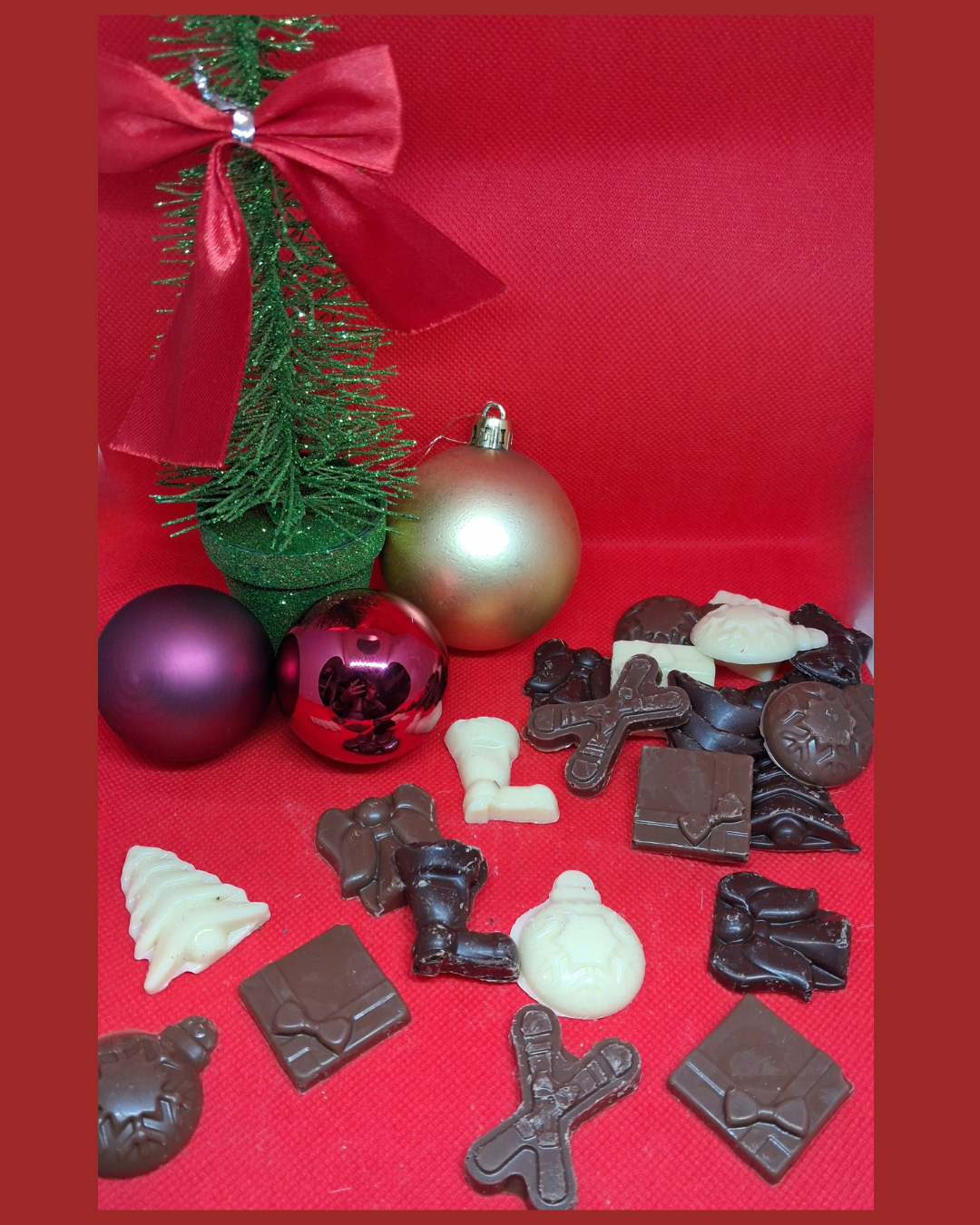 Sachet de friture chocolat de Noël . Proposé en 3 couleurs: Chocolat Blanc, Lait ou Noir.